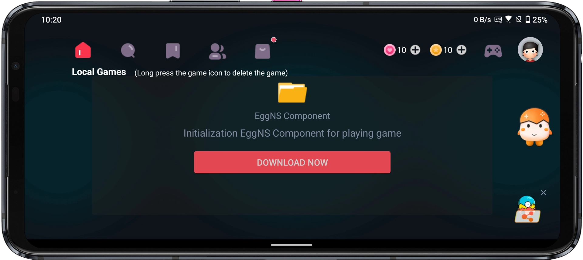 Step 4: You’ll be prompted to download the EggNS Component — tap Download Now. This automatically installs the SwitchDroid folder, which is required for emulation to work.